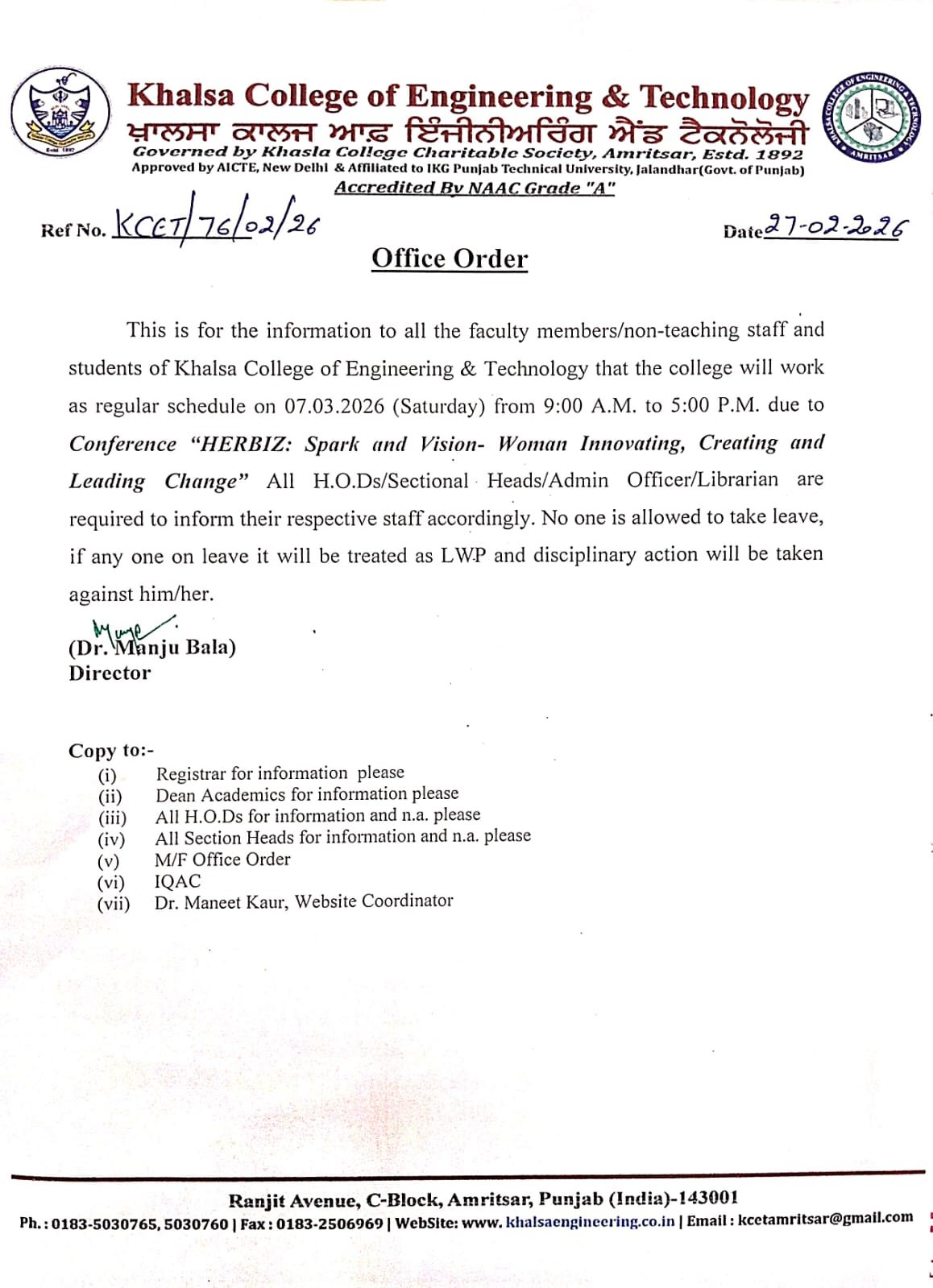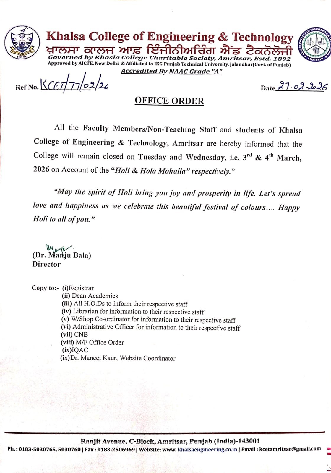 - Office Order: College Closed on 3rd & 4th March 2026 (Holi & Hola Mohalla) NEW